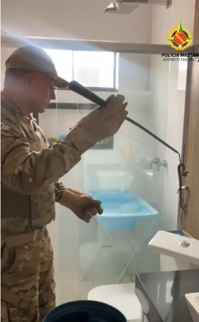 A equipe de policiais militares foi acionada após moradores encontrarem uma serpente dentro da caixa acoplada de um sanitário. No local, os policiais constataram tratar-se de uma jararaca (Bothrops jararaca), espécie peçonhenta e considerada de risco, sobretudo devido à presença de uma criança pequena na residência.