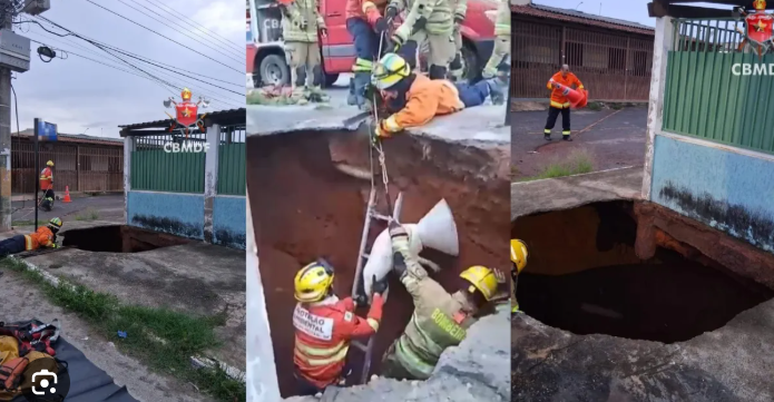 No momento do desmoronamento, dois irmãos — um homem e uma adolescente — caminhavam pelo local e caíram no buraco. Durante a tentativa de socorro, um vizinho deixou o portão aberto e suas duas cadelas também acabaram caindo na cratera.